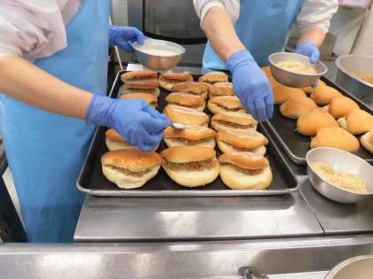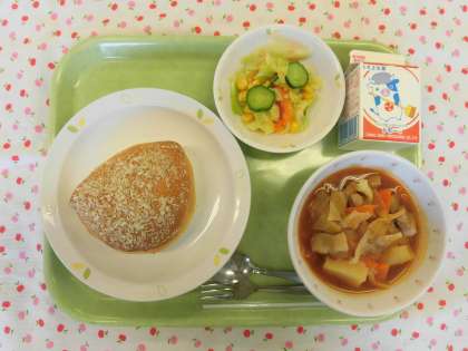 今日の献立は、ロシア料理です。ピロシキは、小麦の生地に肉や野菜などの具をつめてオーブンで焼いたものです。今日は、炒ったパン粉を上にふりかけているので、サクサクした食感が楽しめます。