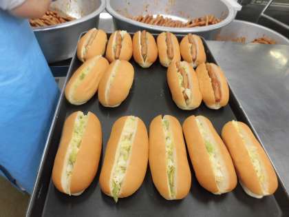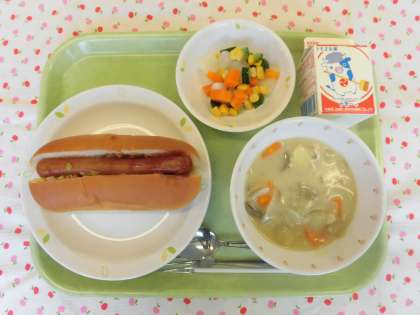 今日は、ホットドッグです。ゆでたソーセージとキャベツをコッペパンにはさみ、軽くオーブンで焼いています。ホットドッグは、アメリカに移住したドイツ人がパンにソーセージをはさんで食べたことから、現在のようなものになったといわれています。