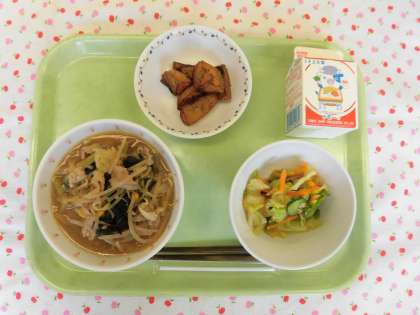 今日は、児童からたくさんのリクエストがあったみそラーメンです。好きな給食ランキングなどでも常に上位に入っているメニューの一つです。