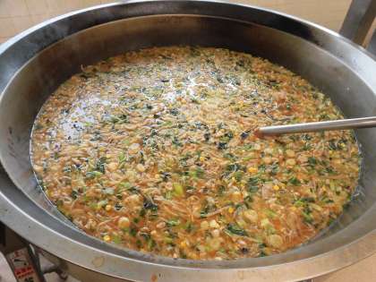 みそラーメンのスープは、鶏ガラスープとかつおだしを合わせて作っています。どちらも、朝早くから給食室で煮込んでいます。
