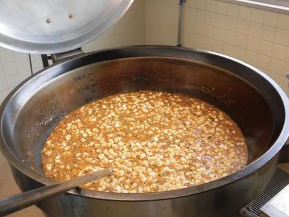 今日は今年度最初の給食です。今日はマーボー豆腐ライスです。全校分で90kgの豆腐を使いました。「豆板醤」という辛味のある調味料を加えることで本格的な味になります。量は控えめなので、子供たちも美味しく食べることができます。