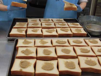 今日の主食は、セサミトーストです。食パンに、白ごまとバターと砂糖を混ぜたものを塗って、オーブンで焼きました。ごまは小さい粒ですが、たんぱく質やカルシウム、マグネシウム、ビタミンEなどを含み、栄養価の高い食品です。