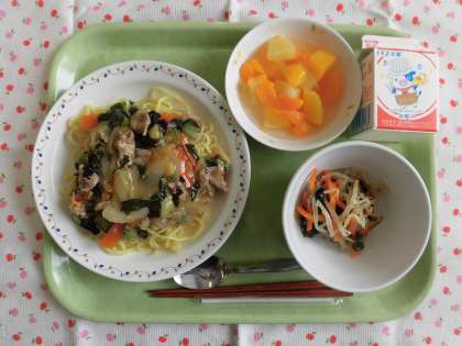 児童からは、「あんかけ焼きそばに入っているきくらげがコリコリしておいしかったです。」「フルーツポンチがとっても甘くておいしかったです。」という感想がありました。