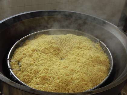 今日は春キャベツのあんかけ焼きそばです。蒸した中華麺に具材たっぷりのあんをかけます。春キャベツを入れ、春らしさを取り入れました。キャベツの他に豚肉や玉ねぎ、にんじん、小松菜、きくらげなど色々な食材が入っています。