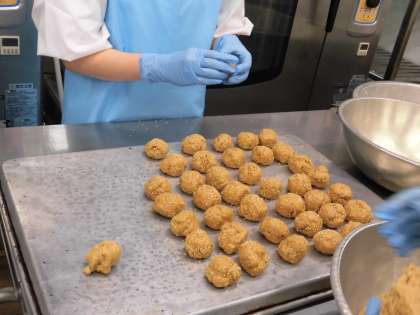 今日はサーターアンダギーを作りました。サーターアンダギーは沖縄県のお菓子です。サータ−は「砂糖」、アンダギーは「油で揚げたもの」という意味があります。沖縄産の黒砂糖も加え、1個ずつ丸めて作りました。