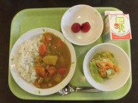 今日の主菜はポークビーンズです。アメリカの家庭料理の一つで豚肉と大豆を使ったトマト味の煮込み料理です。豚肉と大豆は、体をつくるもとになるたんぱく質が含まれています。