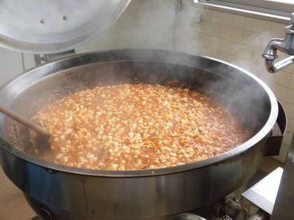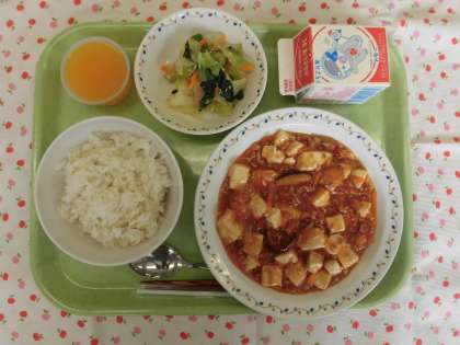 今日の主菜は四湖豆腐です。中国の料理で、中国にある西湖という湖が名前の由来になっています。麻婆豆腐に似ていますが、辛みはなく、トマトとしょうゆで味付けしているので、さっぱりした味わいです。