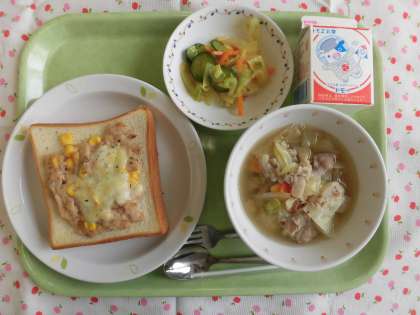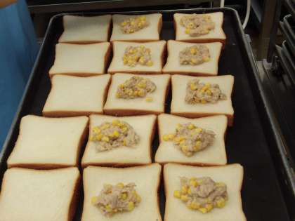 今日の主食はコーン入りツナトーストです。味付けしたツナとチーズをパンに乗せて、オーブンで焼きます。コーンも入っているので、プチプチした食感を楽しむことができます。