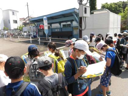 5月17・18日に社会科の学習で町探検に行きました。3コースに分かれて、学校の周りの土地利用と交通の様子を調べました。分かったことは、地図に書き込みました。