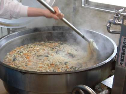 今日の主食は、わかめうどんです。うどんは小麦粉に塩と水を加えて作られる食べ物です。お米が育たない地域でも小麦は育つため、日本では古くからうどんの文化が発展してきました。給食では、食べやすいように細めのうどんを使用しています。