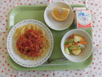 今日の主食はスパゲッティ地中海ソースです。地中海料理は地中海に面したイタリアやギリシャなどで食べられる伝統的な料理です。海の幸に恵まれた地中海料理をイメージし、いかやえびが入ったトマトソースを作りました。