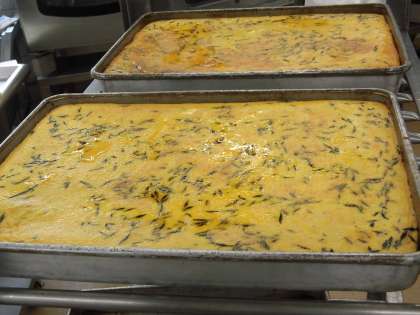 今日の主菜は、ひき肉や野菜が入った五目たまごやきです。卵は良質なたんぱく質が豊富な食品です。また、ビタミンCと食物繊維以外の栄養素もバランスよく含みます。野菜と一緒に食べると、不足している栄養素を補うことができます。