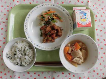 今日は山口県の郷土料理です。「チキンチキンごぼう」は山口県の給食で考案され、人気になった料理です。「けんちょう」は豆腐・大根・にんじんを煮たシンプルな料理です。地域によって他に具材を加えることもあります。「わかめむすび」も山口県の郷土料理の一つのため、主食はわかめごはんにしました。