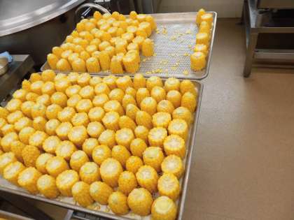 今日の副菜はとうもろこしです。千葉県の多古町でとれたとうもろこしを使いました。とうもろこしは夜の間に甘くなりますが、日中は成長するためのエネルギーとして糖分が使われるため、朝に収穫すると一番甘くておいしい状態で収穫できます。