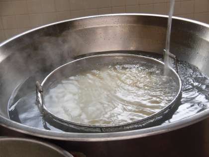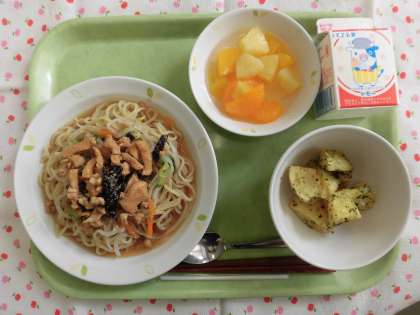 今日は冷し中華です。冷たい麺の上に野菜や肉を乗せてしょうゆ味のたれをかけました。給食室では衛生面に気を付けて作業しました。