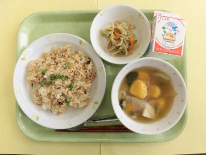 十五夜にちなんだ献立です。今年の十五夜は、9月10日です。1年のうちでもっともきれいな満月が見られる日といわれ、別名「中秋の名月」ともいいます。お月見団子汁には、黄色い満月をイメージして、かぼちゃを練りこんだお団子を入れました。