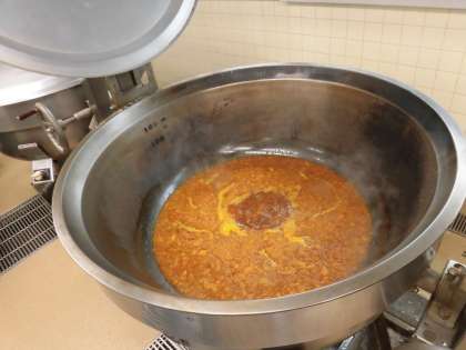 今日の主菜は魚のみかんソースです。みかんソースは、しょうゆなどの調味料にみかん缶の果肉とオレンジジュースを加えて作った特製のソースです。油で揚げた魚にかけてさっぱりといただきます。