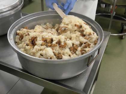 今日はさんまごはんです。さんまは秋の味覚の一つですが、近年は不漁により貴重な食べ物になってしまいました。今日は細切り状のさんまを使い、ごはんに混ぜ込みました。さんまは油で揚げ、たれにからめています。