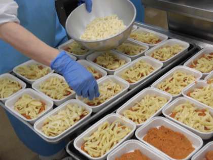 今日の主菜はラザニア風です。イタリアで食べられている「ラザニア」をアレンジした料理です。ラザニアはシート状の平たいパスタのことです。本場ではミートソース、ホワイトソース、ラザニアを交互に重ね、チーズをかけて焼きます。今日は、ラザニアの代わりにフィットチーネというパスタをミートソースに加えました。