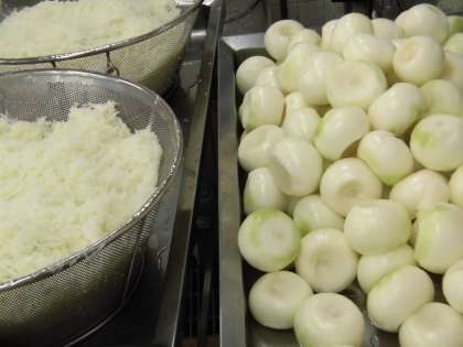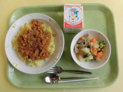 今日の給食は、レンズ豆のドライカレーです。ドライカレーは、ひき肉を使った汁気の少ないカレーです。具材には、みじん切りにした野菜や豆などを入れます。給食では、たくさんの玉ねぎをみじん切りにして加えました。