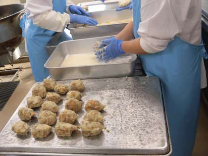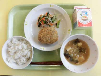 今日の主菜は、きんぴらコロッケです。味付けしたきんぴらごぼうをじゃがいもと混ぜてコロッケにしました。さて、11月8日は「いい歯の日」です。歯を丈夫に保つために必要な栄養素の一つはカルシウムです。今日の献立では牛乳、豆腐、わかめなどカルシウムの多い食材を取り入れました。