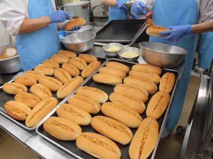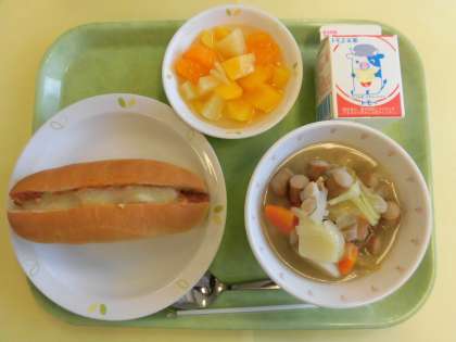 今日の主食は、チリチーズコッペサンドです。パンの中に入っている大豆入りのミートソースは、ケチャップ、ソース、チリパウダーなどで味付けしました。チリパウダーはメキシコ料理でよく使われる調味料です。ミートソースをパンにはさみ、チーズを乗せて、オーブンで焼きました。