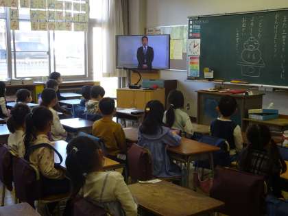 本日、3学期が始まり、元気な子どもたちが学校に戻ってきました。始業式では、校長先生のお話の後、4年生の代表児童が3学期のめあてを堂々と発表しました。