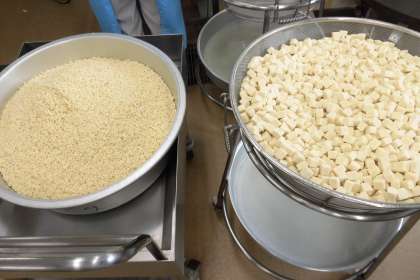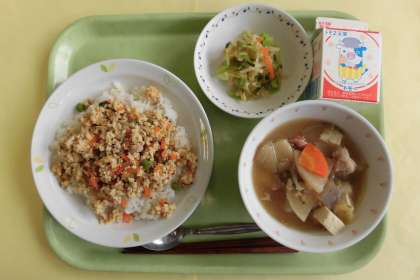 今日は、高野豆腐のそぼろかけごはんです。大豆はそのまま蒸したり、煮たりして食べるほかに、様々な加工品に姿を変えています。高野豆腐も大豆からできる食品の一つです。今日の給食では、写真のように高野豆腐を細かくしてから、肉や野菜と一緒に煮込んでいます。