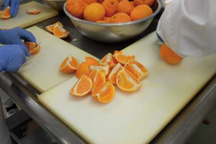 今日の果物は、デコポンです。清美オレンジとポンカンを掛け合わせて生まれたみかんの仲間です。酸味が少なく、まろやかな味わいです。