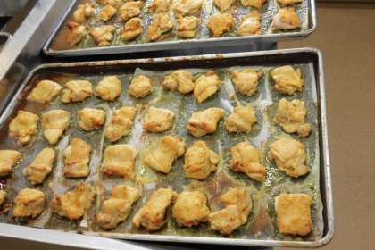 今日の主菜は、タンドリーチキンです。タンドリーチキンは、ヨーグルトとスパイスに漬け込んでから焼く料理です。今日の給食では、ヨーグルトのほかにカレー粉・にんにく・生姜・ケチャップ・たまねぎのすりおろし・塩・こしょうで味つけています。
