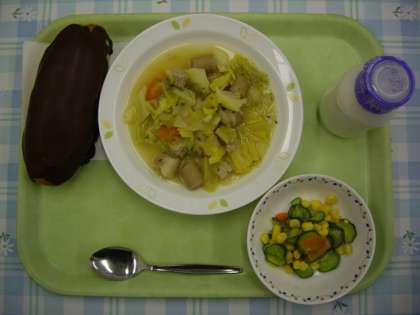 今日のメニューは、「エクレアパン、ポトフ、きゅうりとコーンのサラダ、牛乳」です。
