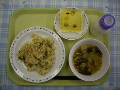 メニューは「鳥五目ご飯、みそ汁、おにむしパン、牛乳」です。おにむしパンには、さつまいもが入っていました。