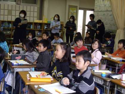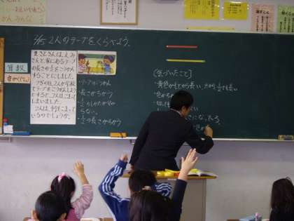2年2組で算数の研究授業がありました。分数の大きさの勉強をしました。テープを比べて気がついたことを発表しました。よく話を聞いて、とても熱心に取り組む様子が見られました。