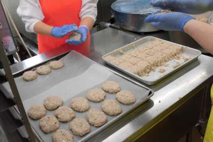 今日の主菜は、れんこん入りつくねバーグです。れんこんは、きんぴらや煮物など和食に欠かせない野菜です。今日は、細かく刻んだれんこんを鶏肉に混ぜ込み、焼きました。