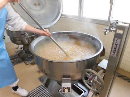 今日から1年生の給食が始まりました。最初の給食はカレーライスです。給食のカレーは、お肉・玉ねぎ・にんじん・じゃがいもなどのたくさんの具材をとても大きな回転釜でじっくり煮込んで作ります。みんなでおいしく楽しい給食時間にしましょう!