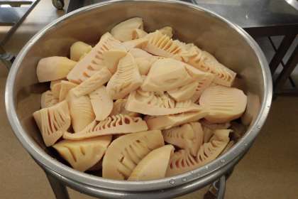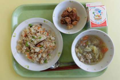 今日は5月5日の「こどもの日(端午の節句)」にちなんだ献立です。今日の中華おこわには、たけのこが入っています。たけのこは成長が早い野菜のため、子供たちの健やかな成長を願い、今日の給食に取り入れました。