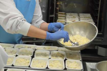 今日の主食は、ポテトグラタンです。グラタンはフランス生まれの料理です。フランス語で「おこげ」や「焦げ目をつける」という意味があります。給食室では、じゃがいも入りのクリームソースを一人分ずつ分け、チーズを乗せてきれいな焼き目がつくように焼きました。