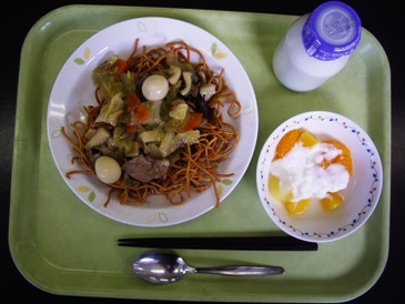 今日の給食のメニューは「五目あんかけそば、フルーツヨーグルト、牛乳」です。午前中、麺を油で揚げる香ばしいにおいがしていました。「あん」には10種類の具が入っていて、栄養たっぷりです。