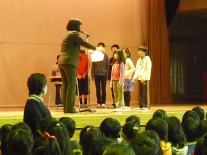2月27日(月)の全校朝会で、「ともしび」の表彰があり、7名の子どもたちが表彰されました。他にも、栽培委員会から「緑の募金」の話と児童会役員から「6年生を送る会のめあて」の発表がありました。
