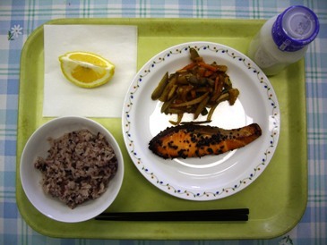 給食のメニューは「黒米ごはん、サケの南部焼き、じゃがいものきんぴら、くだもの(はるか)、牛乳」です。「はるか」は日向夏から生まれた甘くておいしいみかんです。