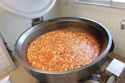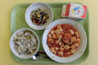 今日の主菜は西湖豆腐です。中国にある「西湖」という湖が名前の由来になっています。見た目は、マーボー豆腐に似ていますが、辛みはなく、トマトやしょうゆで味付けしているので、さっぱりと食べられます。