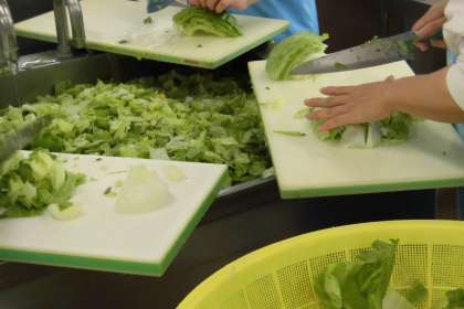 今日の副菜はレタススープです。レタスはサラダで食べること多いですが、スープやチャーハンに入れてもおいしく食べられます。給食室にはたくさんのレタスが届きましたが、スープに入れるとかさが減り、食べやすくなります。