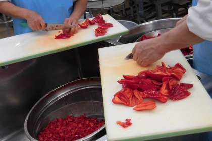 今日の副菜は、カラフルサラダです。カレーだけでは栄養が不足するため、サラダを食べることで栄養バランスがよくなります。今日のサラダは、にんじん、きゅうり、キャベツ、赤ピーマンを入れ、カラフルに仕上げました。果物は、和歌山県産のバレンシアオレンジです。