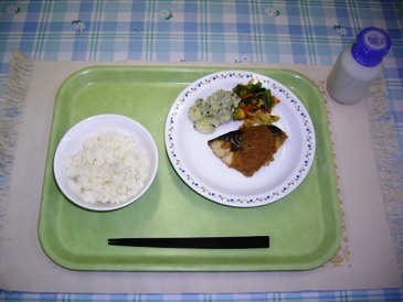 今日のメニューは「ご飯、サバのごまだれかけ、野菜のおかかあえ、いそかポテト、牛乳」です。