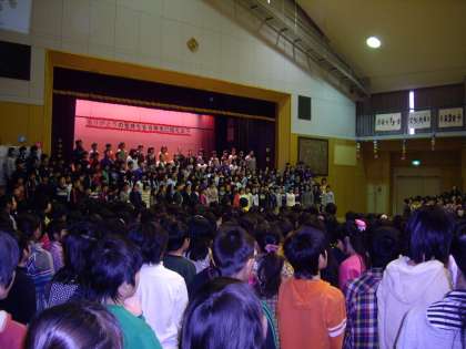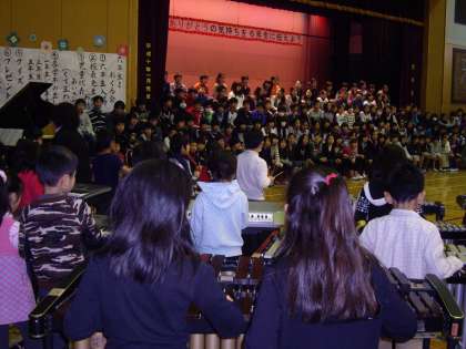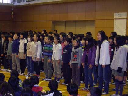 1年生の次に、2年生は、合奏の贈り物をしました。3年生は歌、4年生はリコーダーの合奏をしました。在校生の最後は、5年生が「大地讃頌」を歌いました。お返しに、6年生は「コスモス」を合唱しました。在校生がシーンとして聞きいっていました。最後に全校児童で「大切なもの」を合唱しました。心と心がつながる集会になりました。