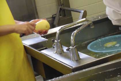 給食では、じゃがいもの皮は機械でむきますが、芽取りは手作業で行っています。