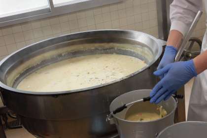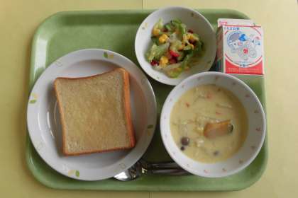 今日の給食は、かぼちゃのクリームシチューです。かぼちゃは夏野菜の一つです。今日はかぼちゃの甘みが感じられるシチューにしました。皮ごと食べると栄養価も高くなります。