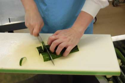 今日の副菜は、夏野菜のポトフです。ズッキーニやコーン、いんげんを加えて夏らしく仕上げました。ズッキーニは外側は緑色ですが、切ると断面は黄色い野菜です。