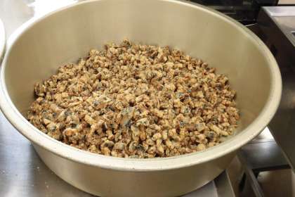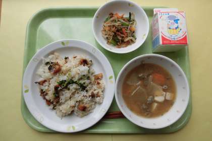今日の主食は、さんまごはんです。細切りのさんまに粉をつけて油で揚げ、たれをからめてからご飯に混ぜ込みました。さんまは秋の味覚を代表する魚ですが、近年はさんまの捕獲量が減り、貴重な食べ物となってしまいました。よく味わっていただきました。