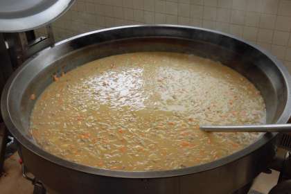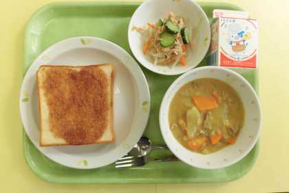 今日の給食は、カレーシチューです。クリームシチューにカレー風味を加えた料理です。カレー味ですが、牛乳が入っているのでまろやかでやさしい味わいです。
